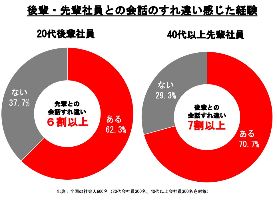 「20代の後輩社員と40代以上の先輩社員がお互いに会話のすれ違いを感じたことがあるか?」という質問を行ったところ、20代の後輩社員では62.3%が「ある」と回答し、40代以上の先輩社員では70.7%が「ある」と答えました。先輩社員の方が若干高い割合で会話のすれ違いを感じていることが明らかになりました。