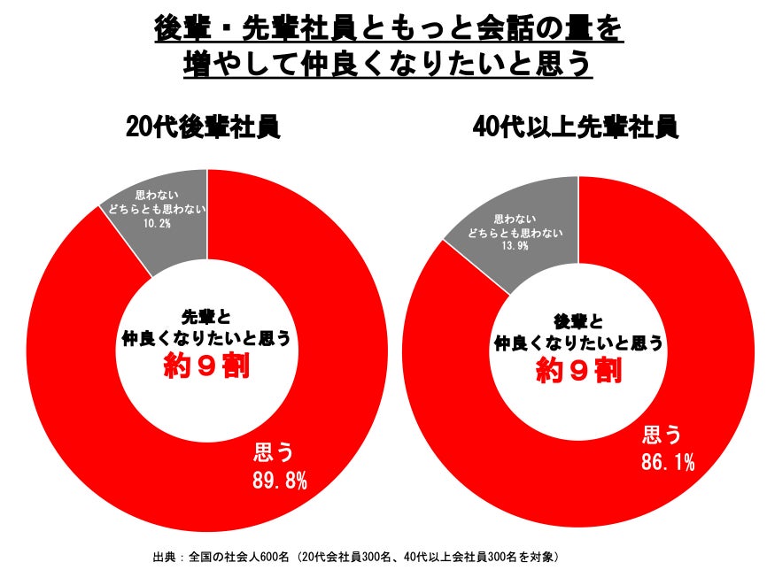 ・ 先輩後輩ともに、約9割がもっと会話の量を増やして仲良くなりたいと回答。