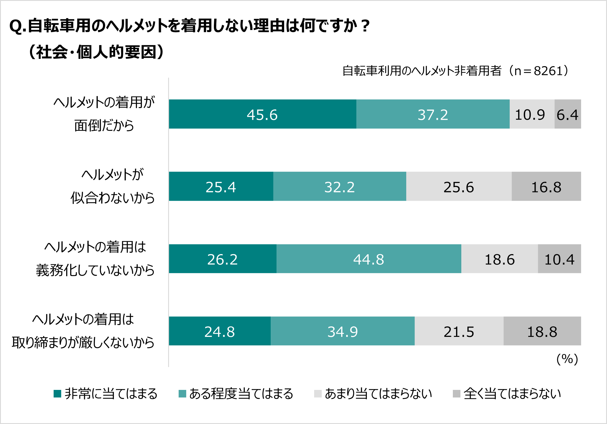 自転車乗用中にヘルメットを着用しない理由は、「ヘルメットの着用が面倒だから」(82.8%)が一番高く、「似合わない」(57.6%)を上回った。ヘルメットの準備や保管場所、持ち運びといった煩わしさがヘルメット着用を妨げる大きな原因の一つのようだ。