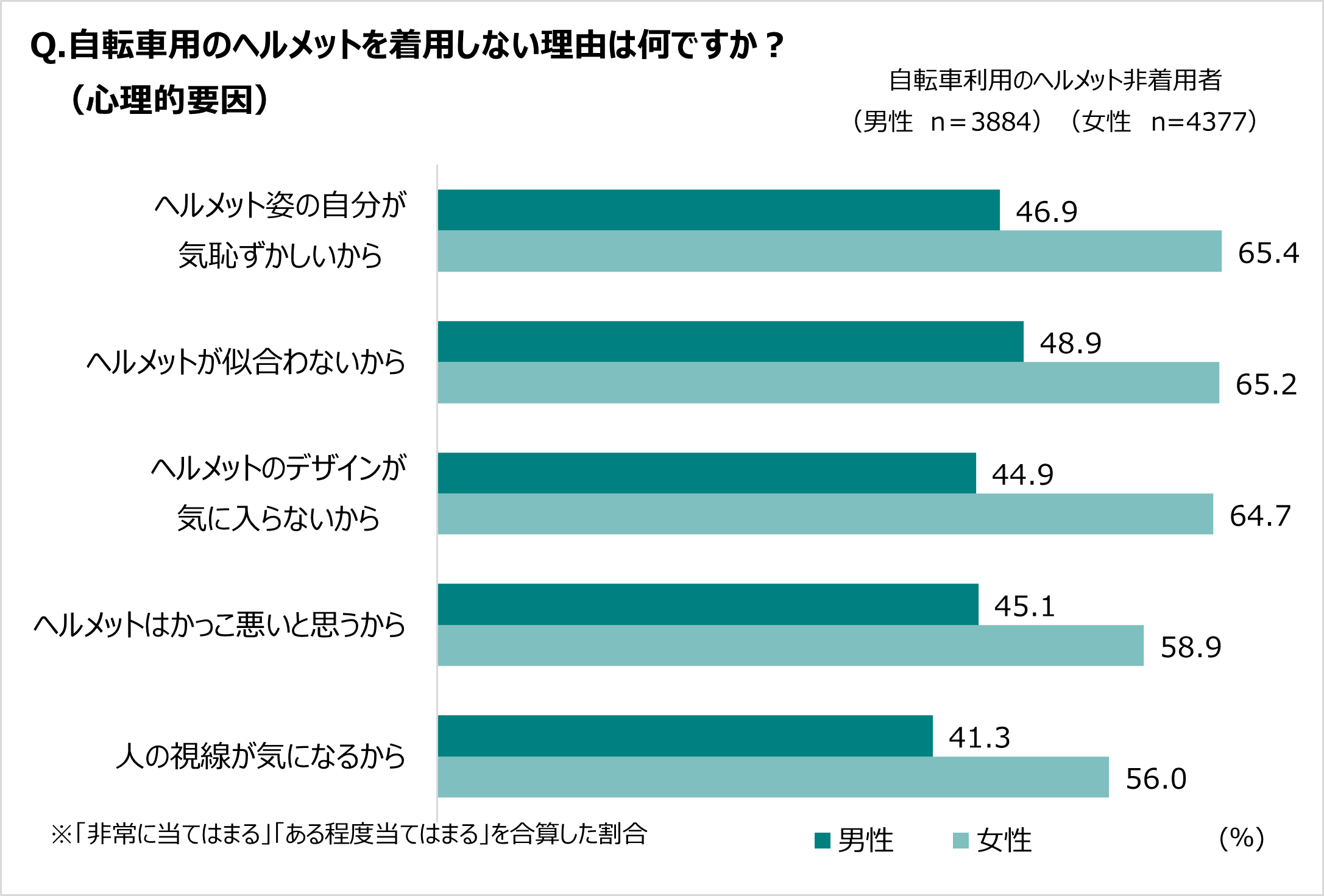 また、心理面から理由を探ったところ、男女の差が見られました。より心理的な壁があるのは女性で、「ヘルメット姿の自分が気恥ずかしいから」(男性46.9%、女性65.4%)、「ヘルメットが似合わないから」(男性48.9%、女性65.2%)に、それぞれ65%以上が「非常に当てはまる」「ある程度当てはまる」と回答。中でも男女差が最も大きかったのは、「ヘルメットのデザインが気に入らないから」(男性44.9%、女性64.7%)で、約20%の差がありました[図5]。