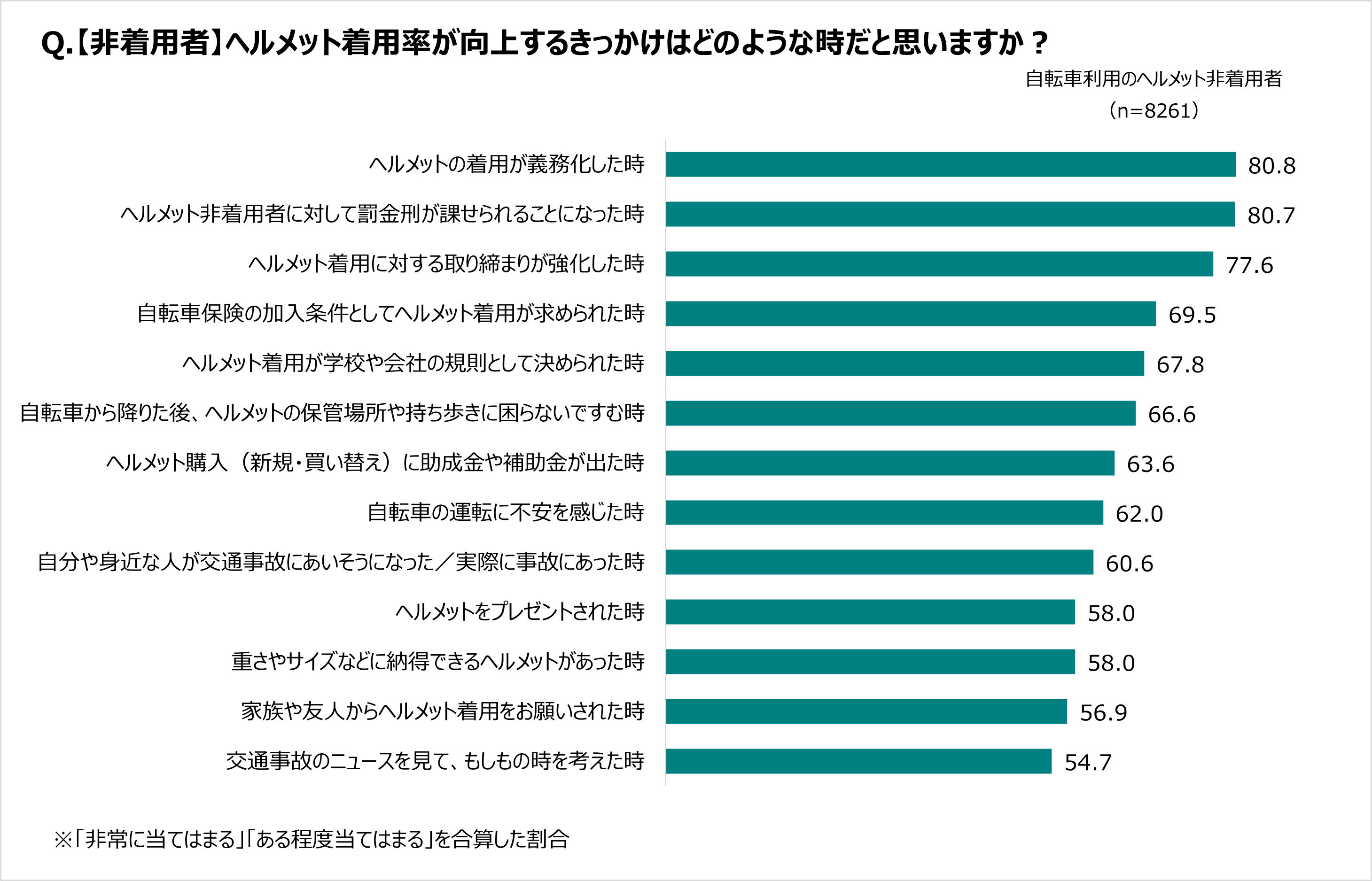 ヘルメット着用率が向上するきっかけはどのような時かを聞くと、ヘルメット着用者、非着用者、自転車に乗らない歩行者・ドライバーの3つのグループとも共通して、「ヘルメットの着用が義務化した時」(着用者82.5%、歩行者・ドライバー82.0%、非着用者80.8%)や、「ヘルメット非着用者に対して罰金刑が課せられることになった時」(78.1%、82.1%、80.7%)、「ヘルメット着用に対する取り締まりが強化した時」(79.7%、81.2%、77.6%)など、法的環境による回答に票が集まりました[図10]。