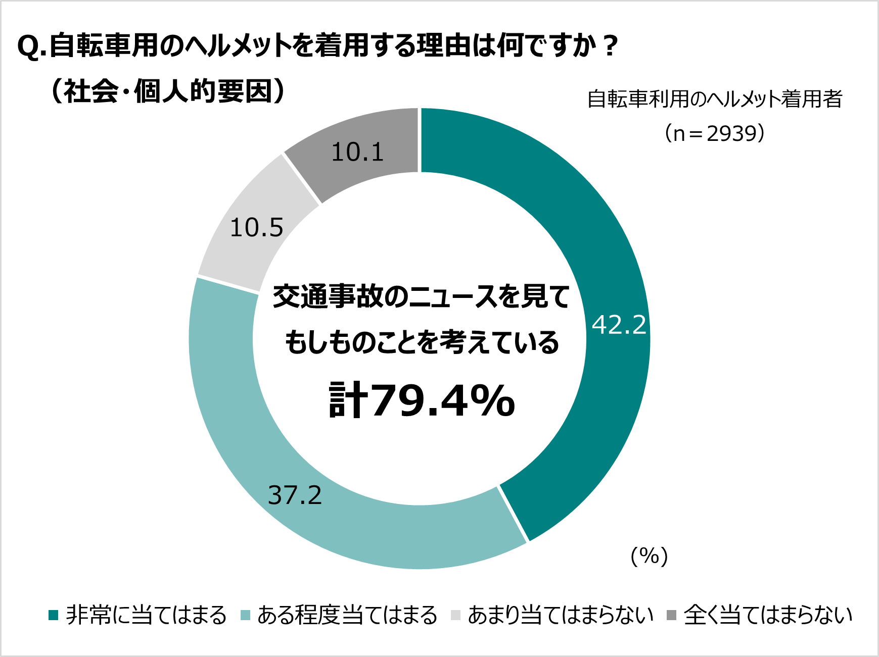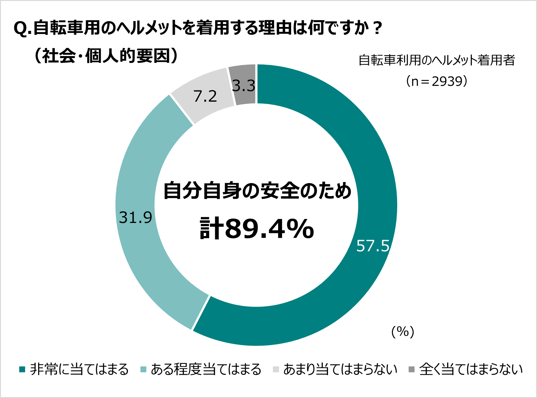 ヘルメットを着用している人に着用理由を聞いたところ、「自分自身の安全のため」(89.4%)、「交通事故のニュースを見てもしものことを考えている」(79.4%)など、交通事故のリスクに対して高い意識を持っていることがわかった。
