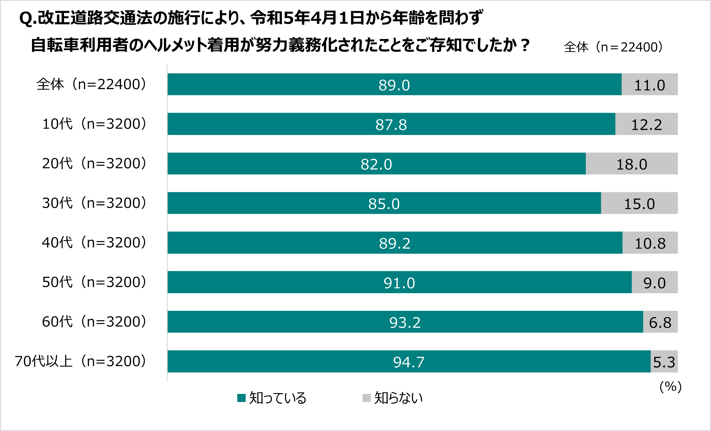 令和5年4月1日から施行された自転車利用者のヘルメット着用努力義務化を認知している人はどの年代においても80%以上で、年代が高くなるほど認知度も高かった。また、その内容を正しく解釈できている人は70%を超えた。