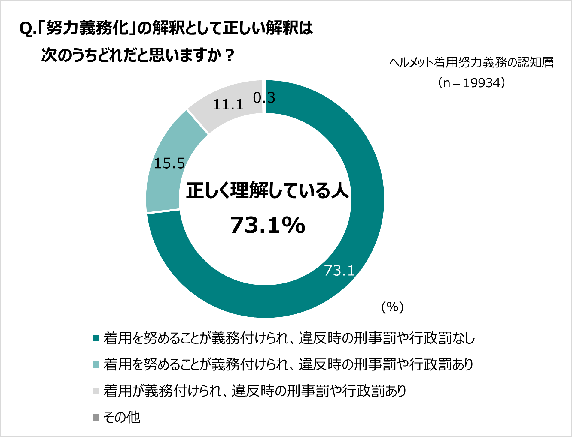 また、理解度を調べるため、法令の解釈に関する選択肢のうち正しい解釈を選ぶ質問をしたところ、正しい解釈である「着用を努めることが義務付けられ、違反時の刑事罰や行政罰なし」と回答した人は73.1%となりました[図4]。