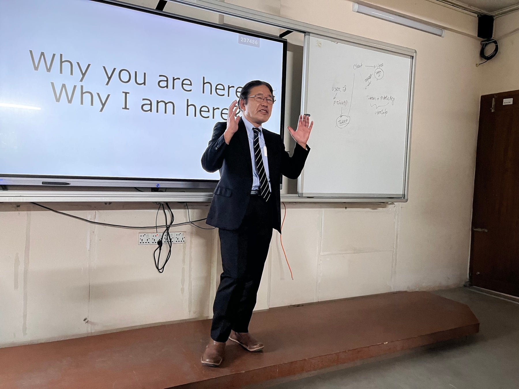 東京語学学校の坂本は同学所属学生に対して、今後のIT教育の展開について講演をし、学生や記者への質問に答えました。