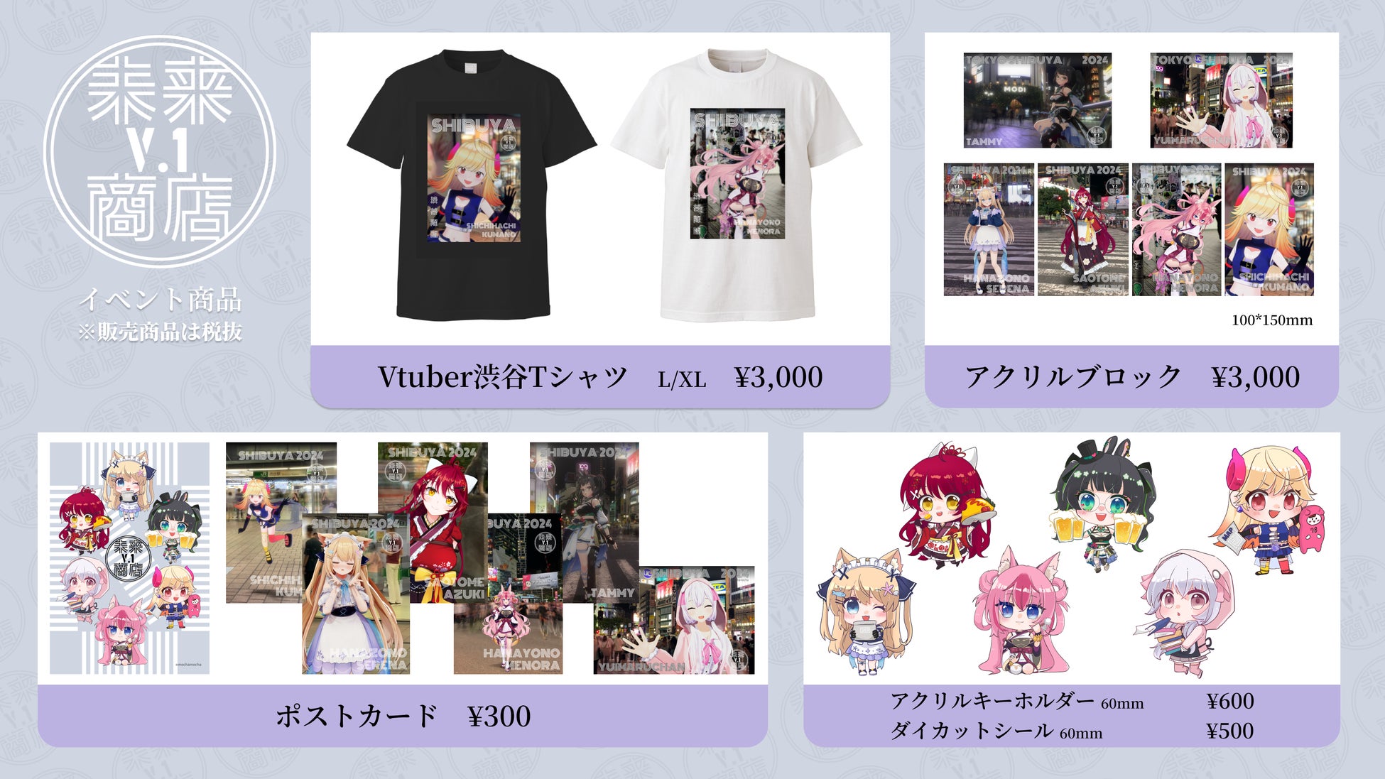 今回のイベントに合わせてオリジナルVtuber商品を販売します。商品は「Tシャツ」「アクリルブロック」「ポストカード」SDキャラの「アクリルキーホルダー」「ダイカットシール」を販売。店舗限定商品の販売もあるので是非店頭にお越しください!