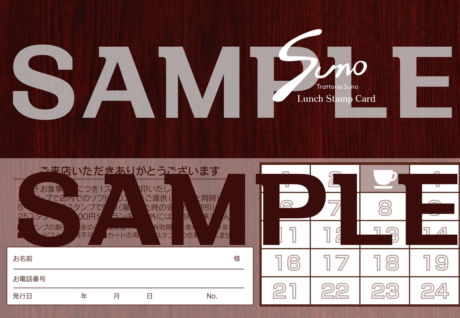 ランチタイムにご利用いただくお客様を対象に新たなサービスとして、スタンプカードを導入いたします。このスタンプカードは、ランチをご利用いただくごとにスタンプを押印し、一定の回数に達することで割引やドリンクサービスを受けられる特典をご用意しております。