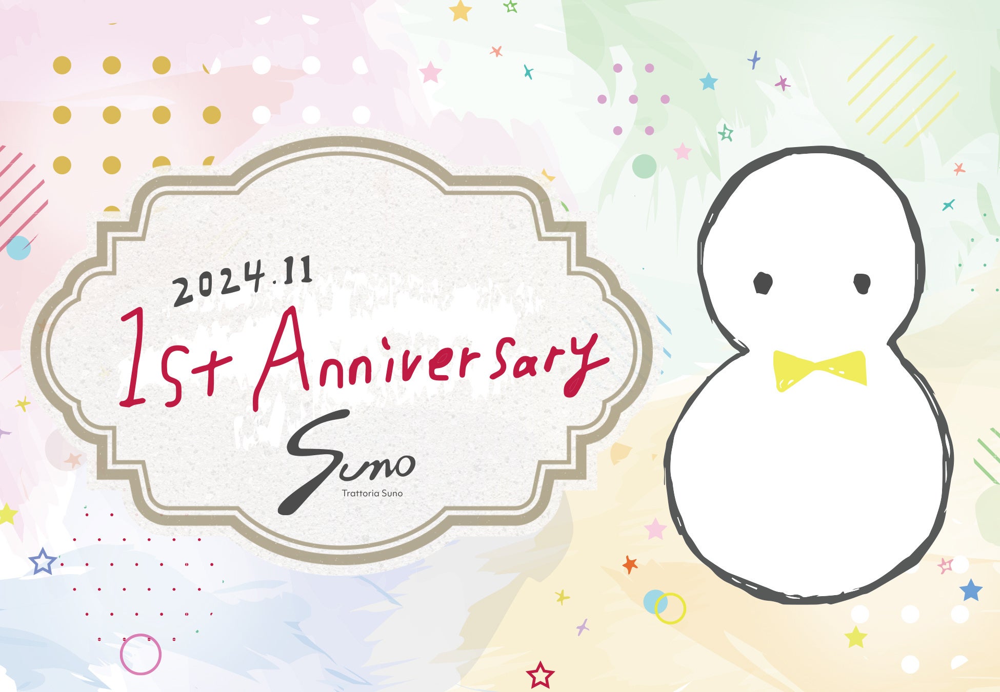夫婦二人で運営する雪だるまのキャラクターの看板が目印の三越前駅から徒歩2分 Trattoria Suno (トラットリア スノウ)が1周年を記念して11月1日 (金) から1周年イベントを開催!