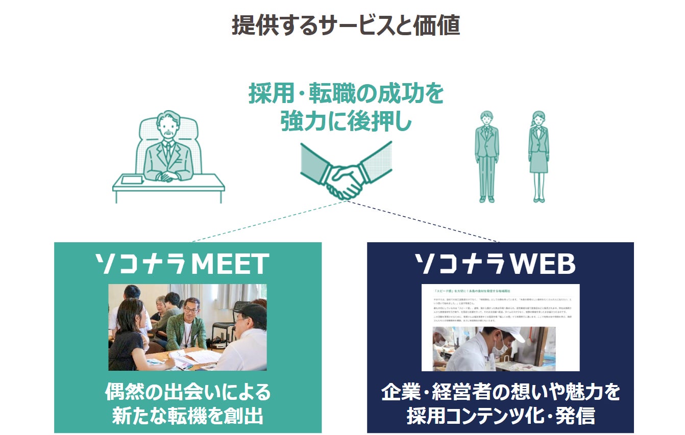 ソコナラは、「そこなら はじまる 地域での第一歩。」というコンセプトのもと、求人企業と転職希望者が対面で一堂に会するワークショップの機会「ソコナラMEET」、企業の魅力を採用コンテンツとしてWEB上に掲載するサービス「ソコナラWEB」を通じ、人・企業・地域にとって新たな転機を創造するサービスを提供します。
