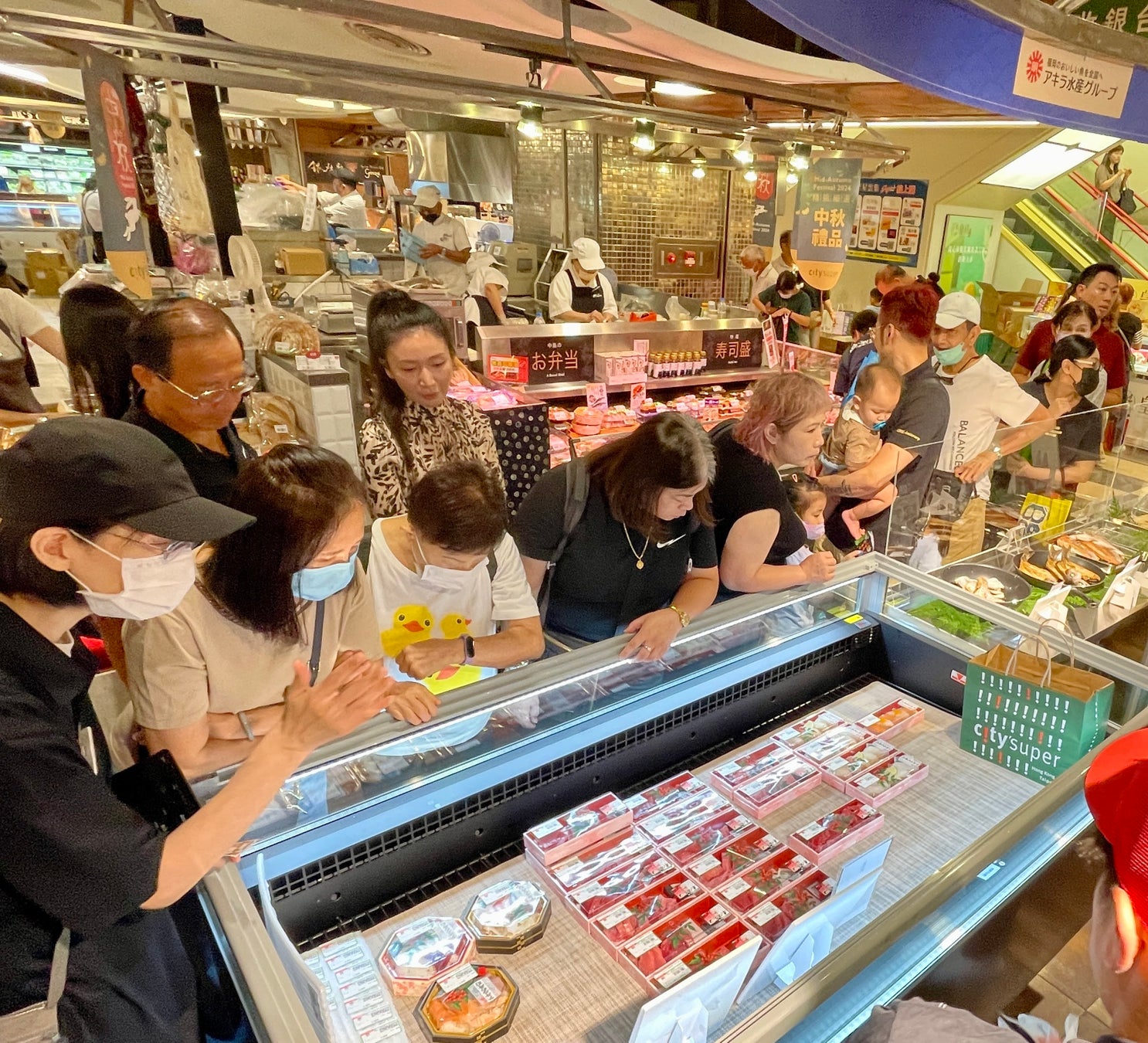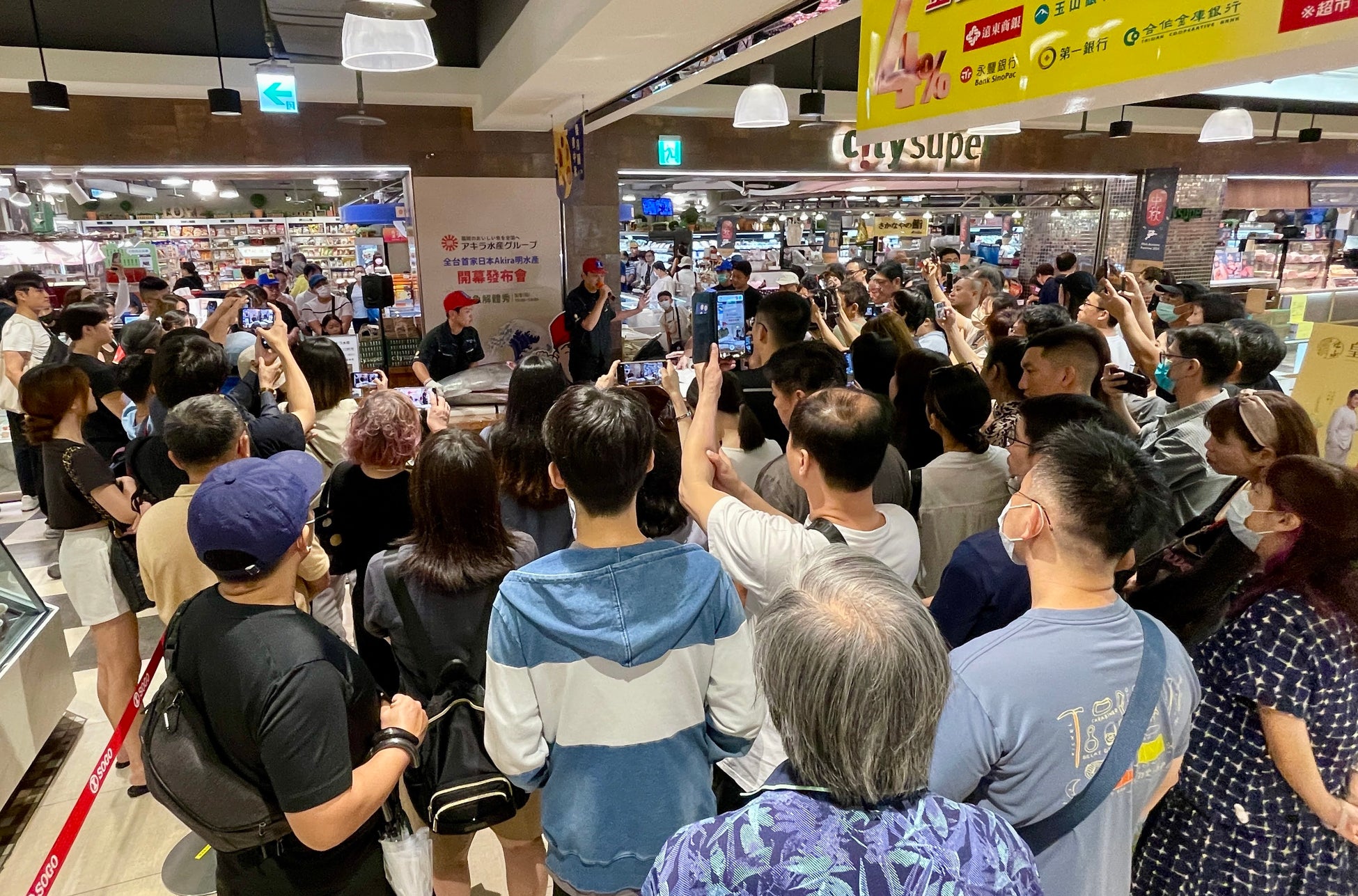9月1日(日)にオープンしたアキラ水産 City’ super復興店で、オープニング・セレモニー・イベントを9月8日に(日)にCity super 台湾 社長 劉 朝雄氏、商田實業有限公司 会長 林 啟森氏をお招きし開催しました。イベント開催時には、店舗前のフロアが来客で満杯になるほど盛況となり、用意した商品がすべて売切れになるなど好評裏に閉会しました。