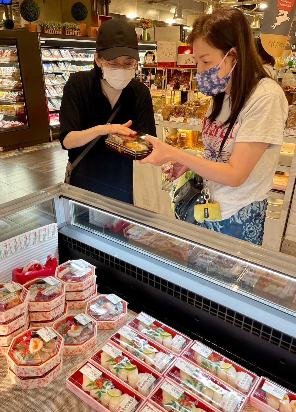 店内では、アキラ水産が誇るトップクラスの目利き取扱技術で選りすぐった福岡産や九州産の水産物を中心に、刺身、焼き魚、一夜干し、握り寿司、海鮮丼、チラシ寿司など台湾の方が食べやすい品揃えとなっています。スタッフが、仲卸ならではの目利き、魚種毎の特徴や旬、日本産の素晴らしさ、美味しい食べ方など試食を交えた対面で、お客様とコミュニケーションを取りながら提供しています。