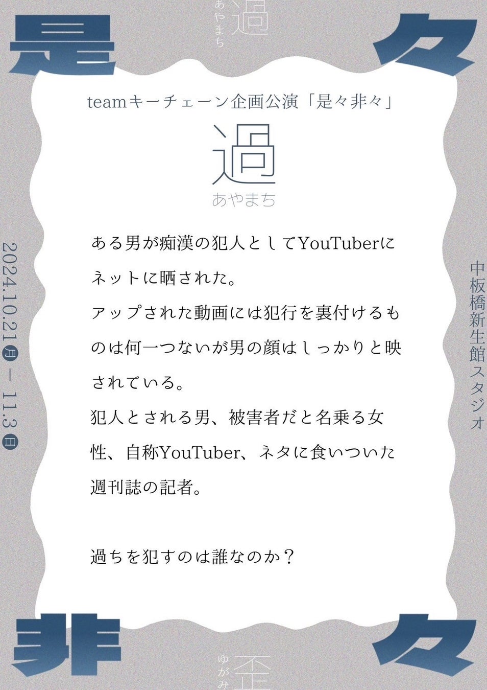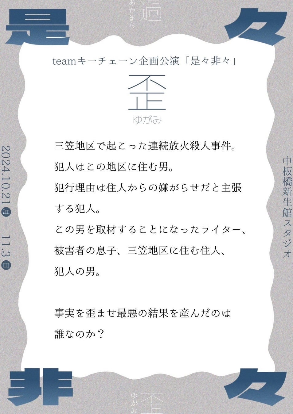 【インタビュー】 独自の視点で演劇を作り続けるteamキーチェーン1年ぶりの最新作 曖昧な価値観を見せる実験的公演 観た人の「是々非々」を問う作品