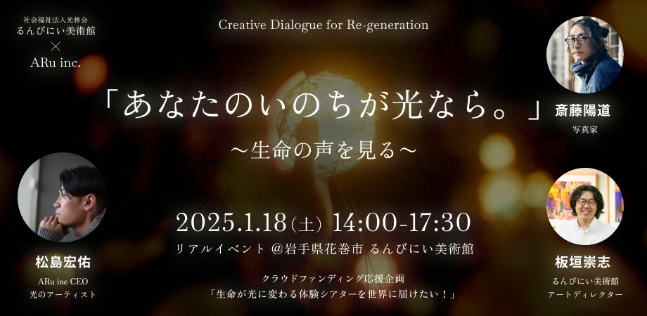「生命の力が光として現れる瞬間」を見つめ続けてきた齋藤氏が、るんびにい美術館のシアターを体験。ARu 松島宏佑氏、るんびにい美術館ディレクター板垣崇志と共に「生命の声」をテーマに語り合います。