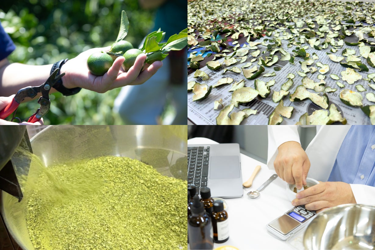 主原料の翡翠みかんは、ミシュラン星付きレストランや一流のパティシエにも愛されている藏光農園の翡翠みかん。社長自ら収穫し、皮を剥き乾燥、他の素材と同じように石臼で製粉し、外注に出さず一本一本社内で手作りしています。