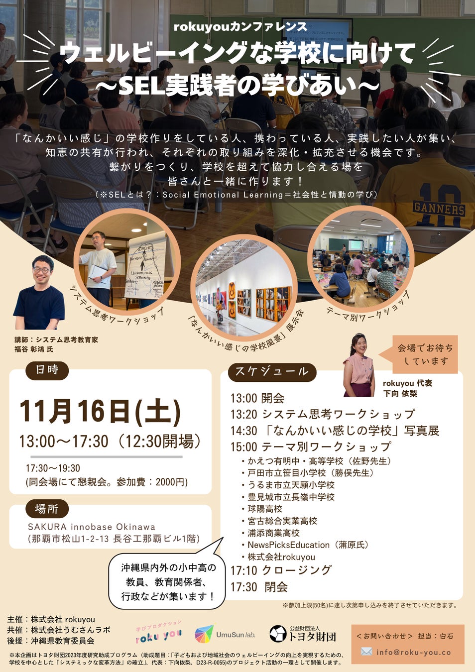株式会社rokuyou(沖縄県那覇市、代表取締役:下向依梨、以下:rokuyou)は、rokuyou初となる教育カンファレンスを2024年11月16日(土)に沖縄県で開催いたします。本会は「SEL(Social Emotional Learning/社会性と情動の学び)」を土台に、ウェルビーイングな学校づくりを推進する実践者が集まり、直面する課題の解決に向けた知恵を得ながら自校の取り組みをより充実させていくための機会です。