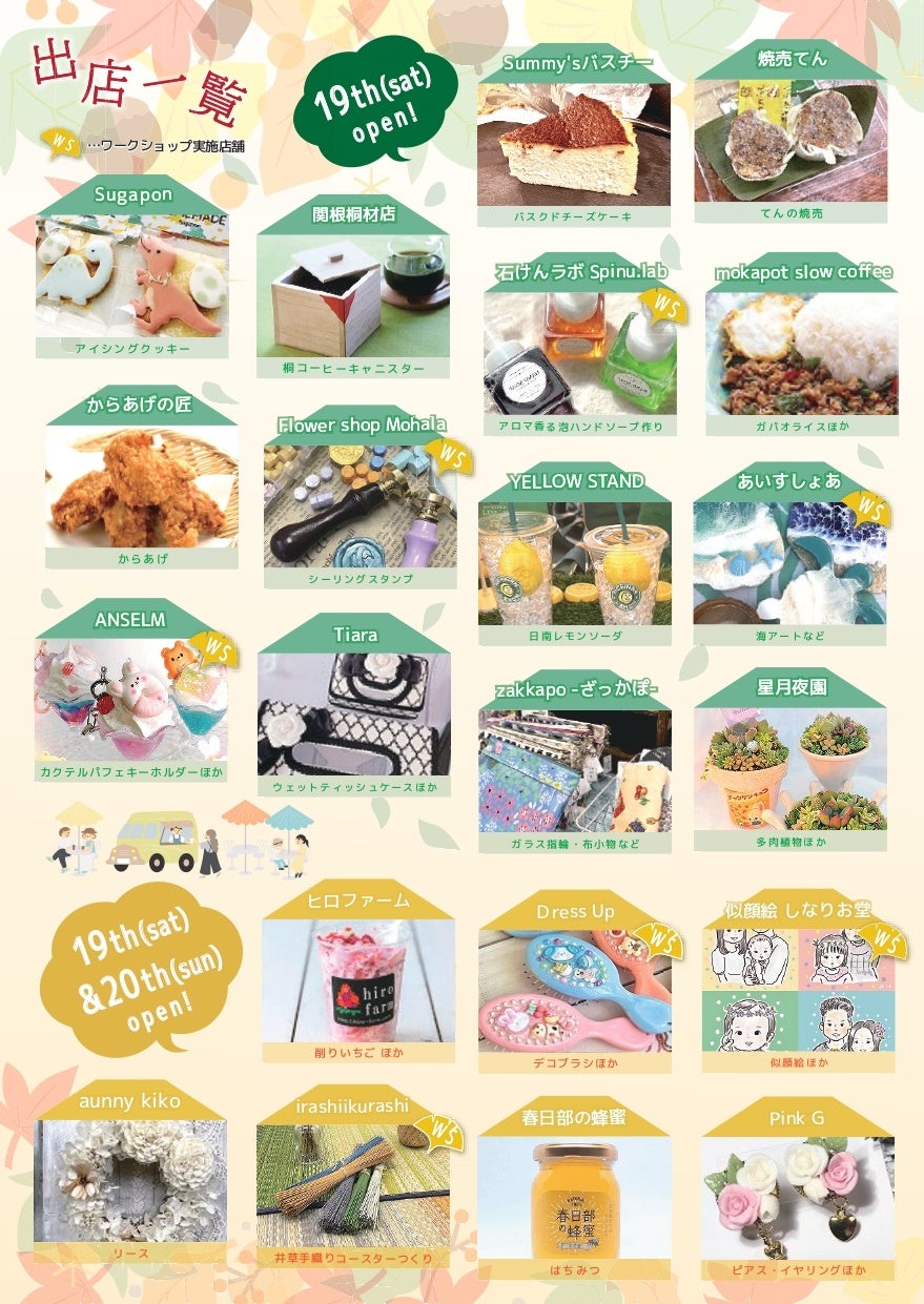 (キッチンカー4台、フード10店舗、クラフト12店舗、ワークショップ12店舗)