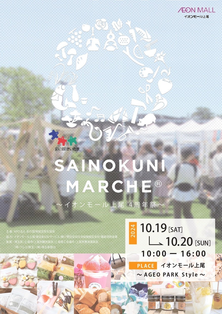 NPO法人 彩の国地域活性化協会(拠点:埼玉県さいたま市、代表理事:佐々木 輝伸)が主催する「彩の国マルシェ」は、2024年10月19日と20日の2日間、埼玉県上尾市にあるイオンモール上尾のAGEO PARKにて「彩の国マルシェ~イオンモール上尾4周年祭~」を開催いたします。