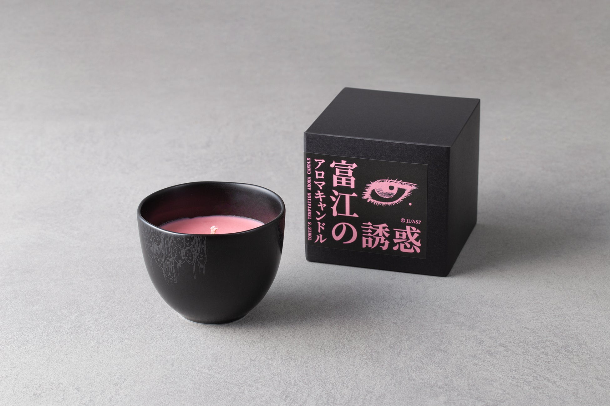 伊藤潤二氏協力のもと制作した特別な香りが、アロマキャンドルになって登場します。「富江の誘惑 エッセンシャルオイル」の香りを華やかなピンクのロウに溶け込ませ、富江の妖艶な魅力を表現。美濃焼を使用したキャンドル容器には、「富江」シリーズのエピソード『もろみ』に登場する樽から溢れ出る富江の姿を高精細レーザーで彫刻し、不気味で幻想的な世界観を表現しています。
