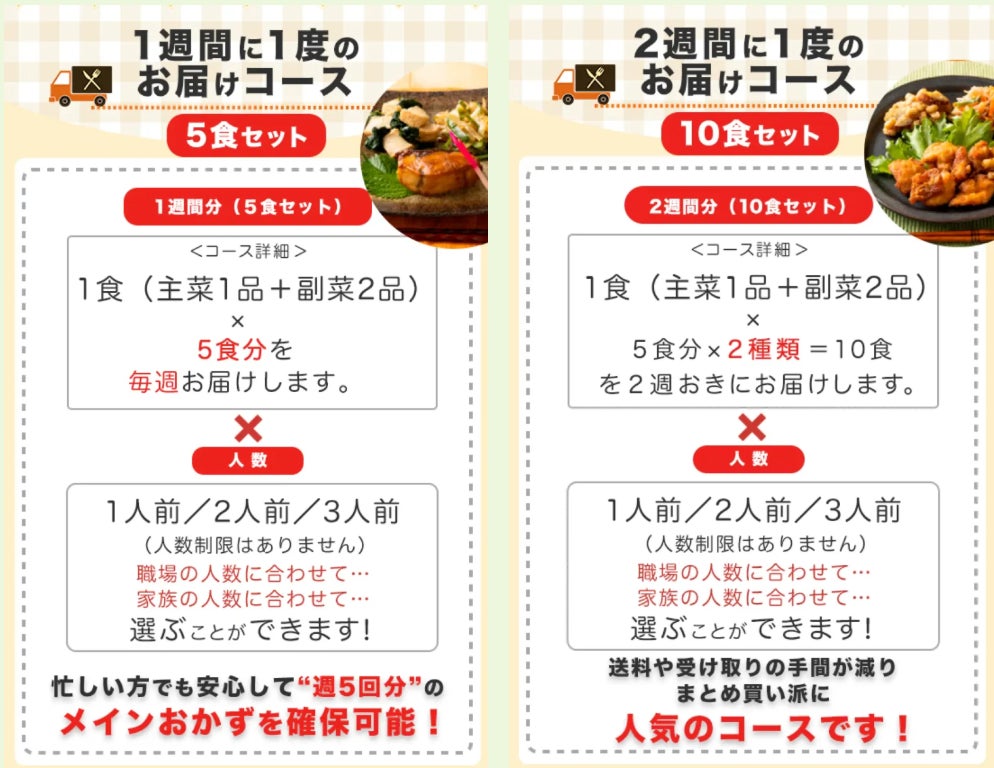 お届け頻度は、「1週間に1回」「2週間に1回」から選択が可能です。
