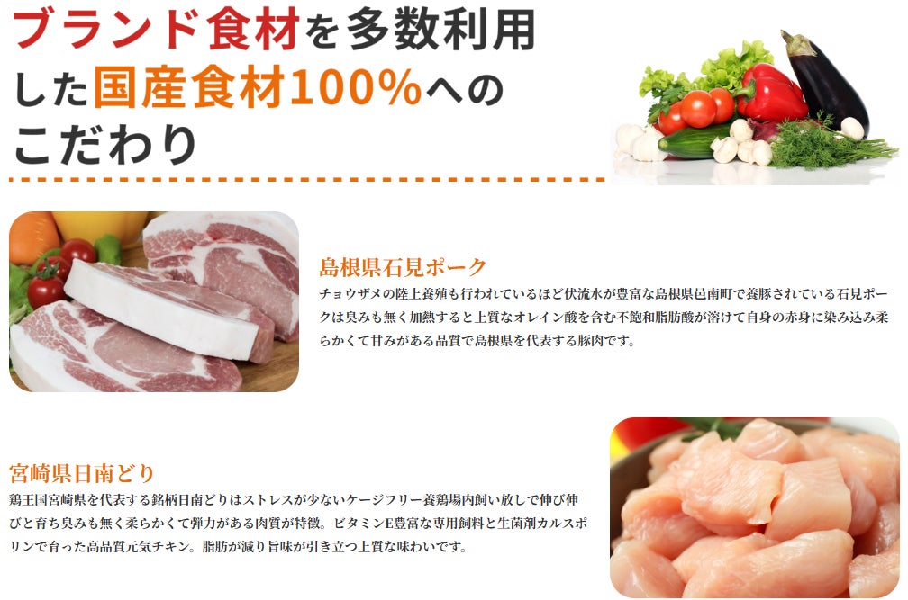 使用するすべての食材において100%国産を徹底しています。野菜、肉、魚など、どの素材もブランド食材を使用し冷凍とは思えないほどの自然な風味が楽しめます。