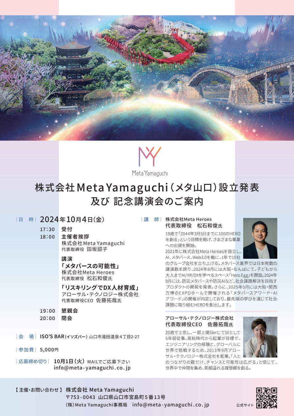 オリジナルメタバース制作やeスポーツイベントを通して、若者のリーダー育成を目指す「株式会社MetaYamaguchi」の設立を記念し、グループ会社である株式会社Meta Heroes 代表取締役 松石和俊氏をお招きし、記念講演会を開催いたします。