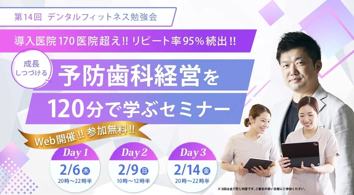【デンタルフィットネス】来院者様リピート率95% 予防歯科だけで売上一億円を超える歯科経営を120分で学ぶ無料オンラインセミナー 2月6日、9日、14日に開催