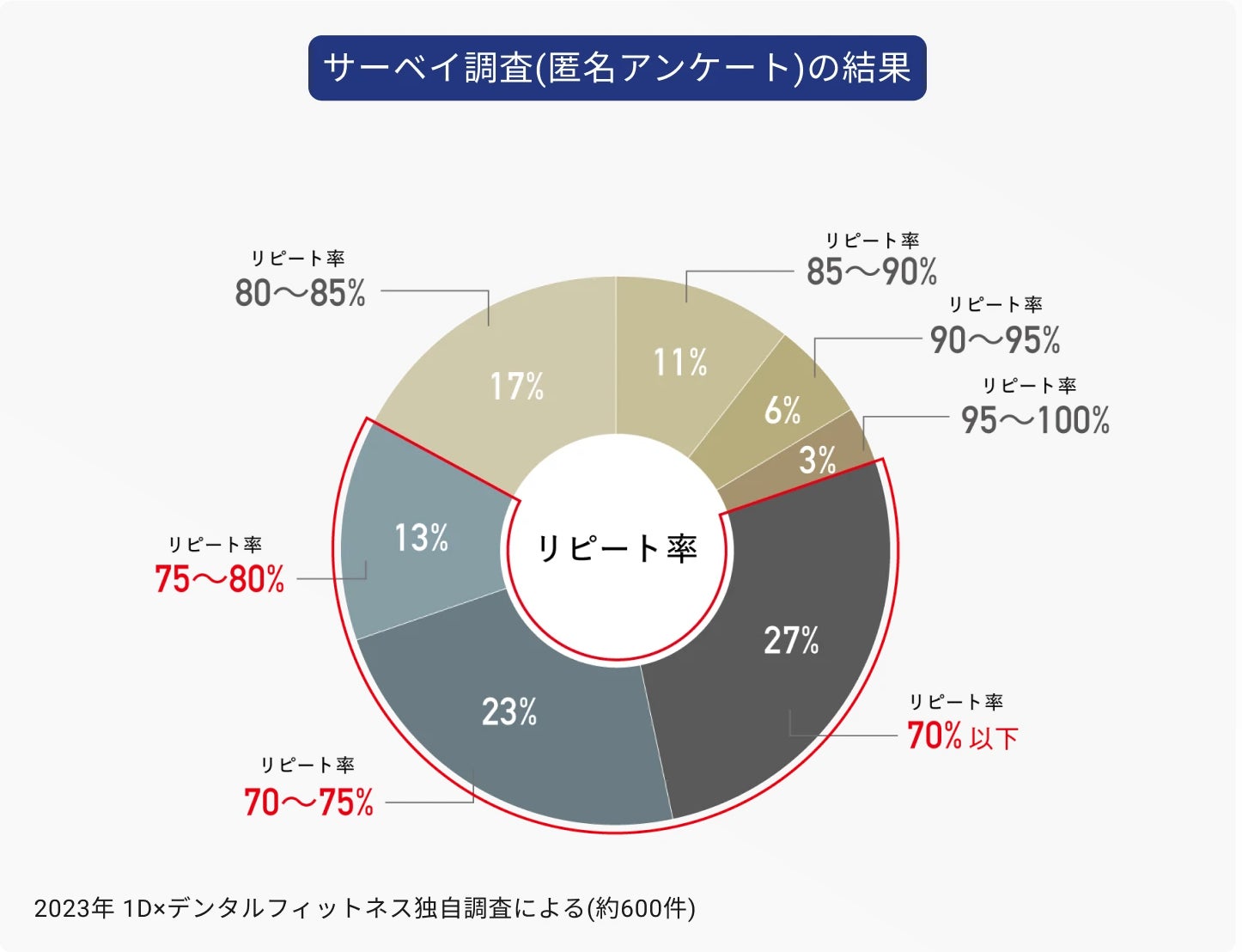 弊社独自のアンケートを行った結果、予防歯科の来院者様の中で次に来院するリピート率の全国平均は70〜80%であることがわかりました。