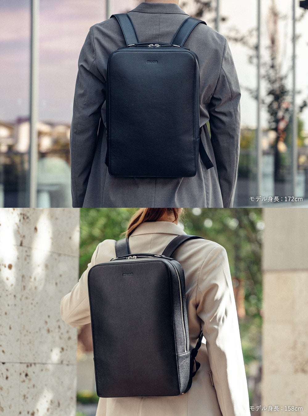 muonのバッグは、男女問わず背負ったときに美しく見えるサイズ・形状に設計されています。