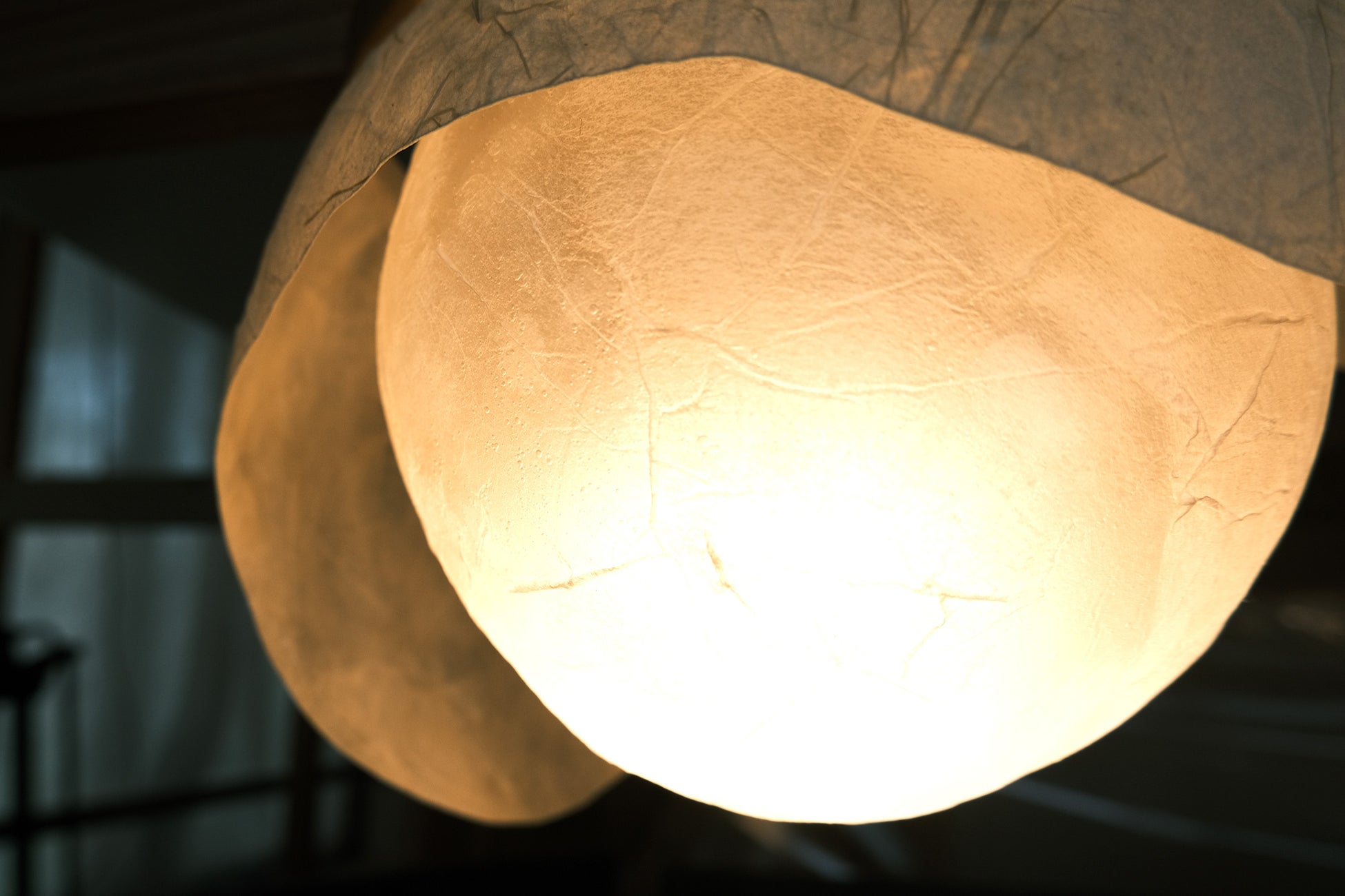 和紙の選別、澱粉、膠などの組み合わせ、配合、制作方法など、数百パターンの実験、研究を繰り返し、光の透過具合と商品として耐えられる強度など兼ね備えた和紙ランプが完成しました。