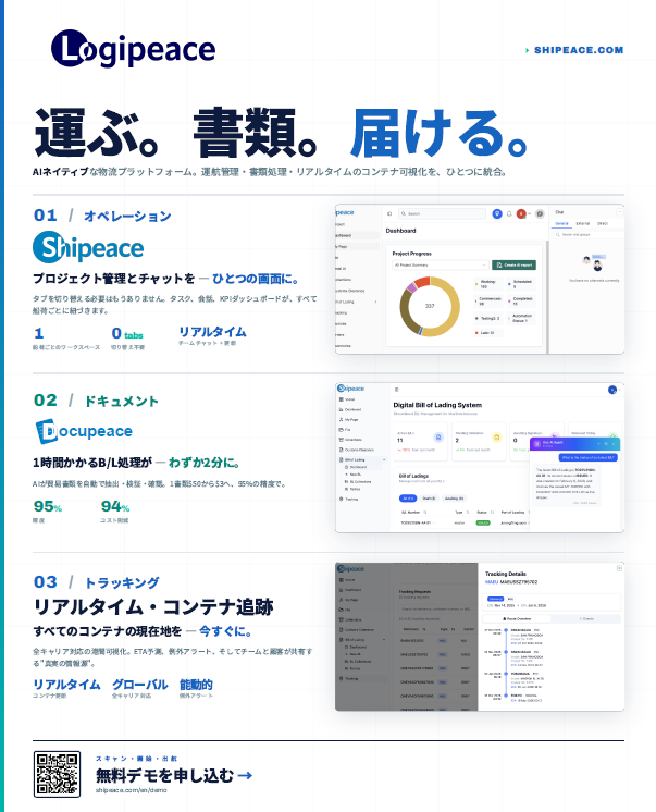 一方、Logipeace Pte. Ltd.は、2022年に設立されたシンガポール発の物流テクノロジースタートアップです。ShipeaceおよびDocupeaceのプラットフォームを通じて、プロジェクト管理、統合チャット、AI文書処理、リアルタイム貨物トラッキングの可視化などを提供し、物流現場の業務最適化と生産性向上を支援しています。