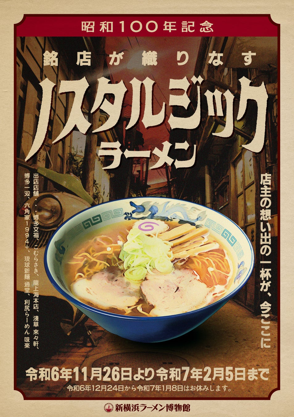 新横浜ラーメン博物館(横浜市港北区、代表取締役:岩岡 洋志)は、開業から一貫して昭和を打ち出してまいりました。そして、昭和100年を迎える今、コンセプトを「ノスタルジック(懐かしさ)」としたラーメン企画『昭和100年記念 銘店が織りなす“ノスタルジックラーメン”』を開催いたします。