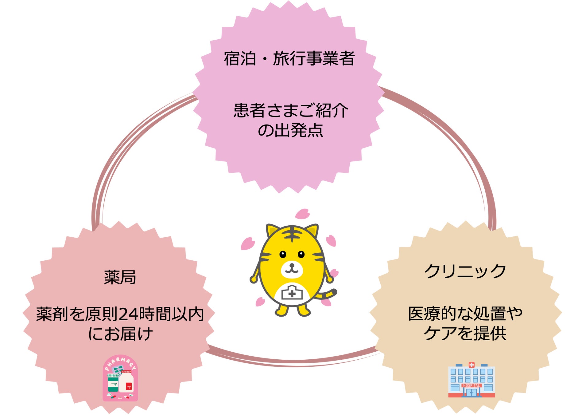 『とらほす』に加盟いただいている事業者をご利用されている外国人観光客さまが体調不良になられた際に、すぐにクリニックにご紹介いただける体制を整えております。