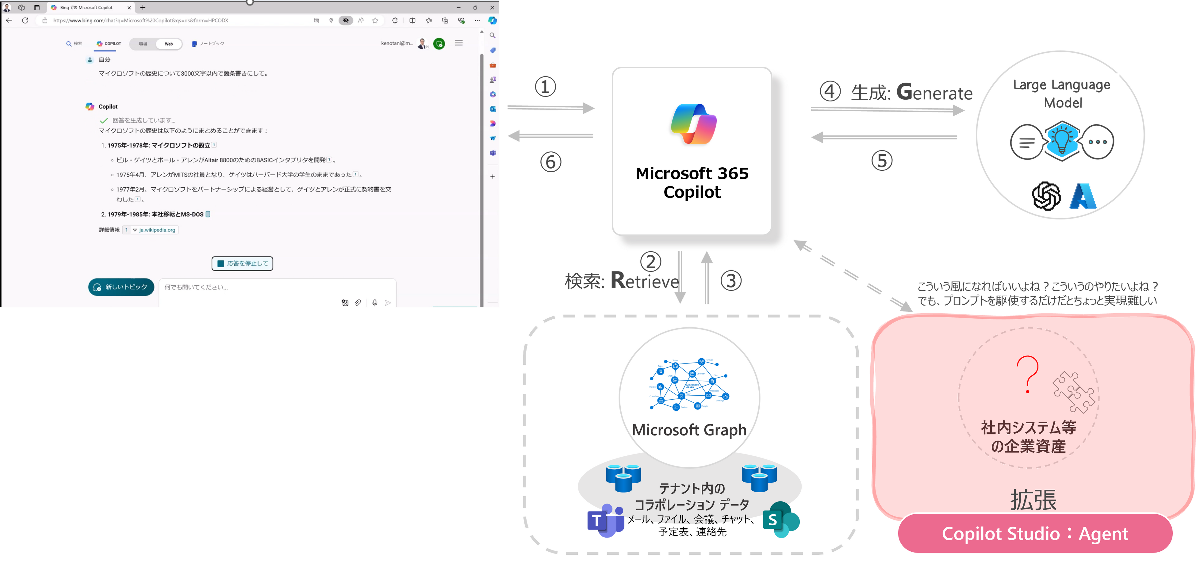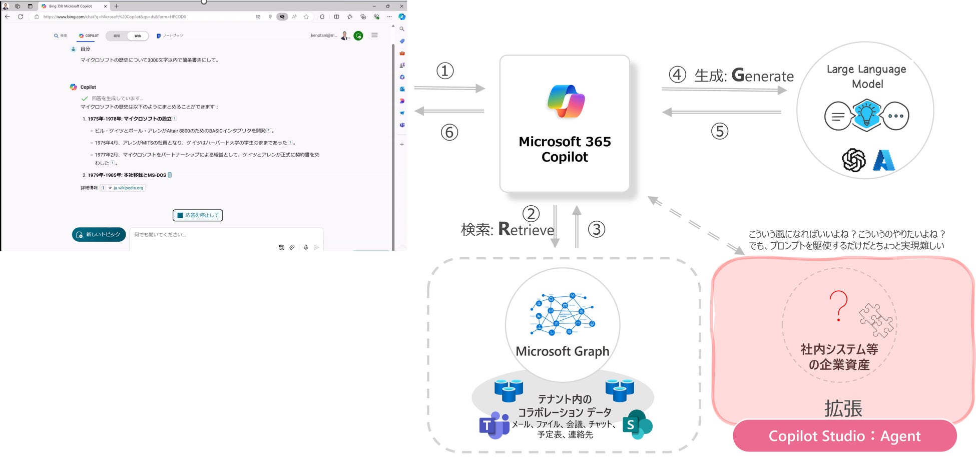 KMSG-AI 開発における最大の特徴は、コスト効率と開発スピードにあります。Microsoft 365 Copilot は、1 ユーザーにつき年間約 5 万円のライセンス費用が発生するため、全社展開は現実的ではありませんでした。しかし Microsoft Copilot Studio を採用して環境構築すれば、テナント単位でライセンスを購入することで、指定の社内情報にアクセスできます。これにより、コストを抑えつつ、同等の利便性を実現できるようになりました。