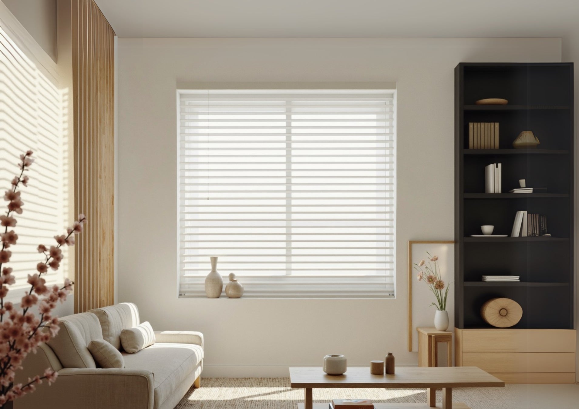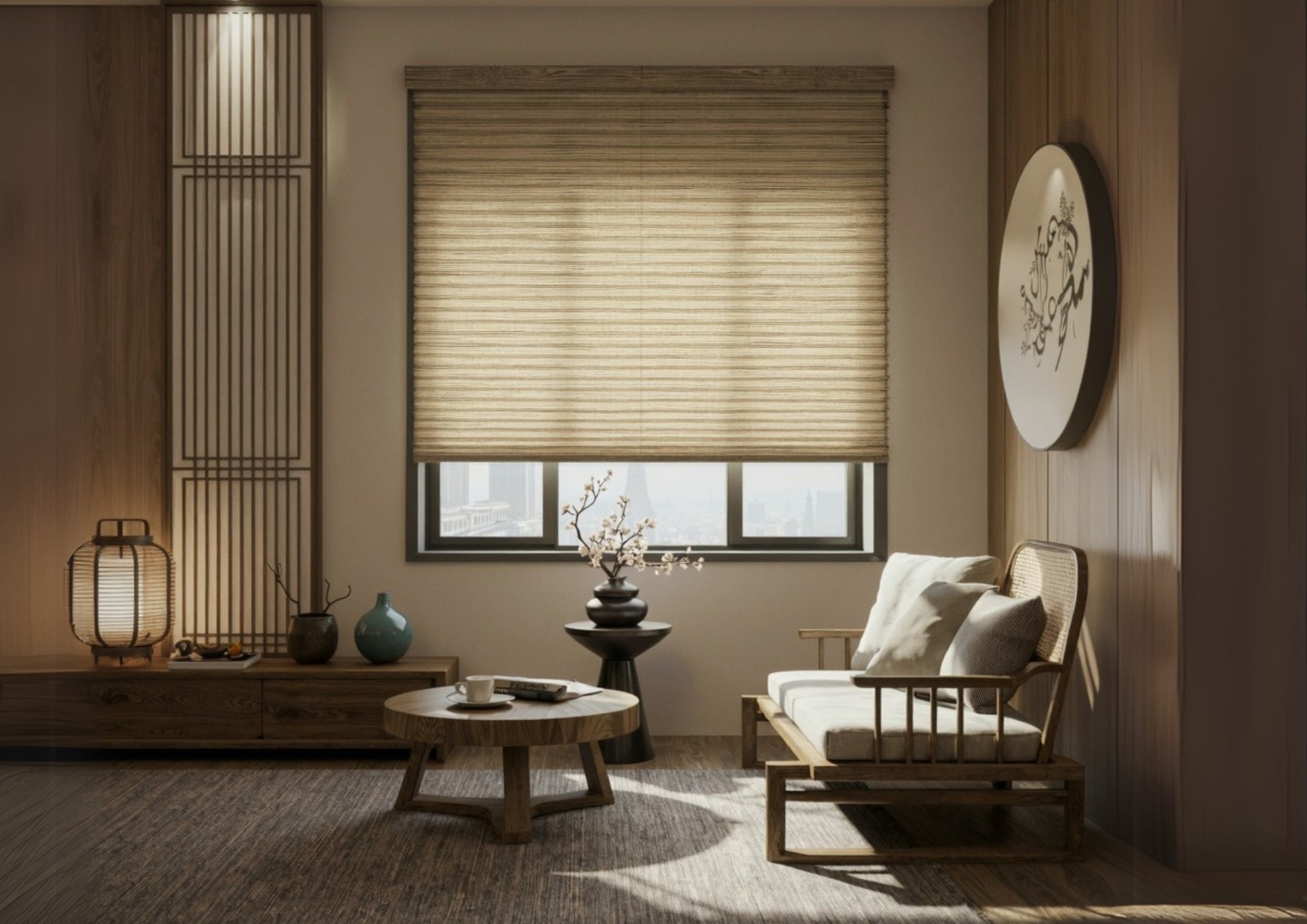 シャングリラシェード: 立体三層構造の生地が柔らかな光を室内に取り込み、優しい空間を演出します。