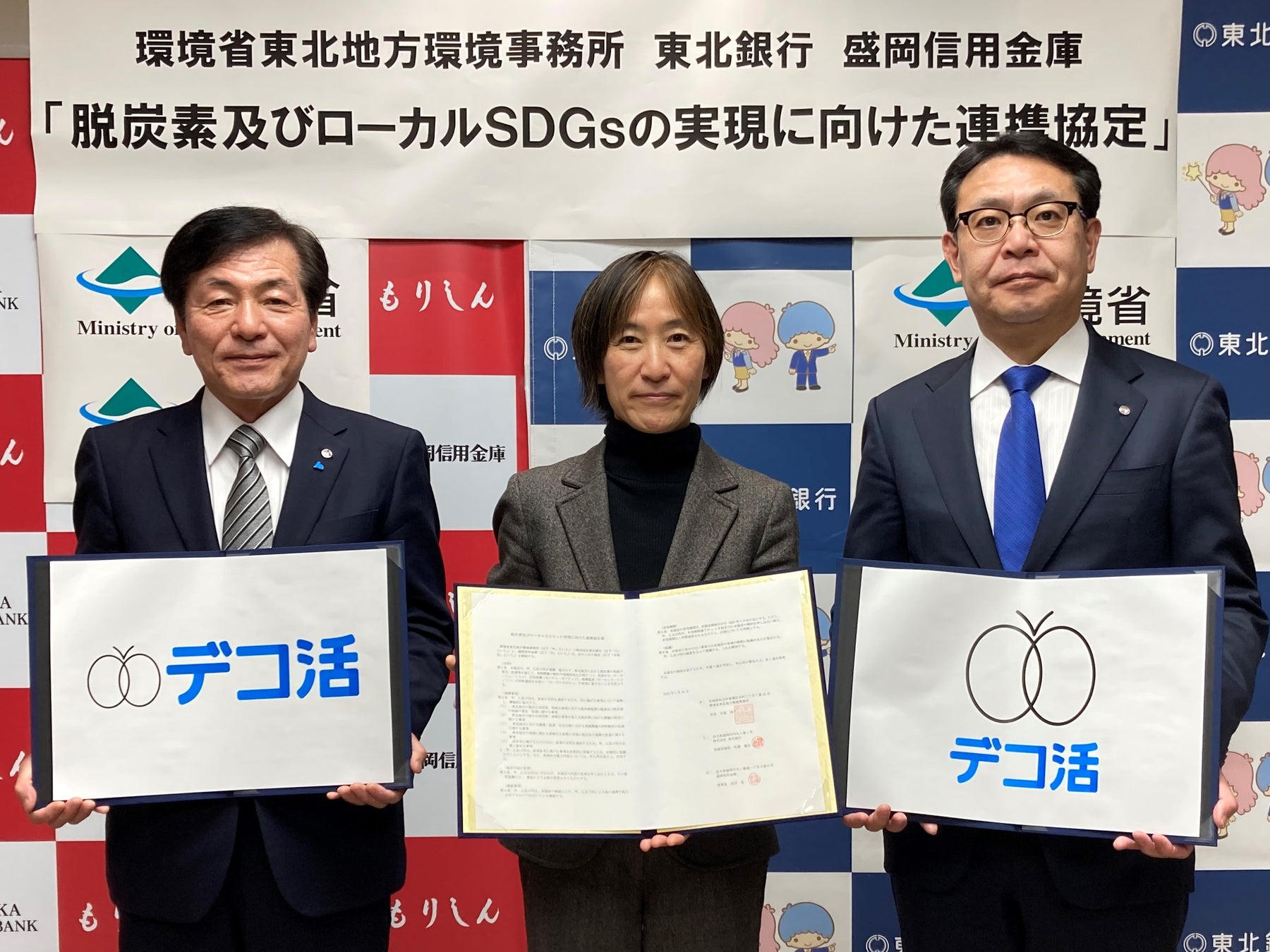 株式会社東北銀行(取締役頭取 佐藤 健志)と盛岡信用金庫(理事長 浅沼 晃)は、環境省東北地方環境事務所と、「脱炭素及びローカルSDGsの実現に向けた連携協定」を締結しましたので、下記のとおりお知らせします。