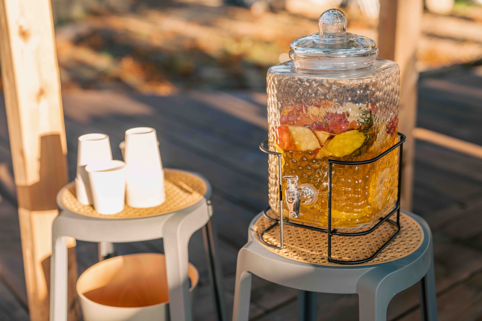 玄米焙じ茶をベースに季節のフルーツをたくさん使って無料でご用意しています。