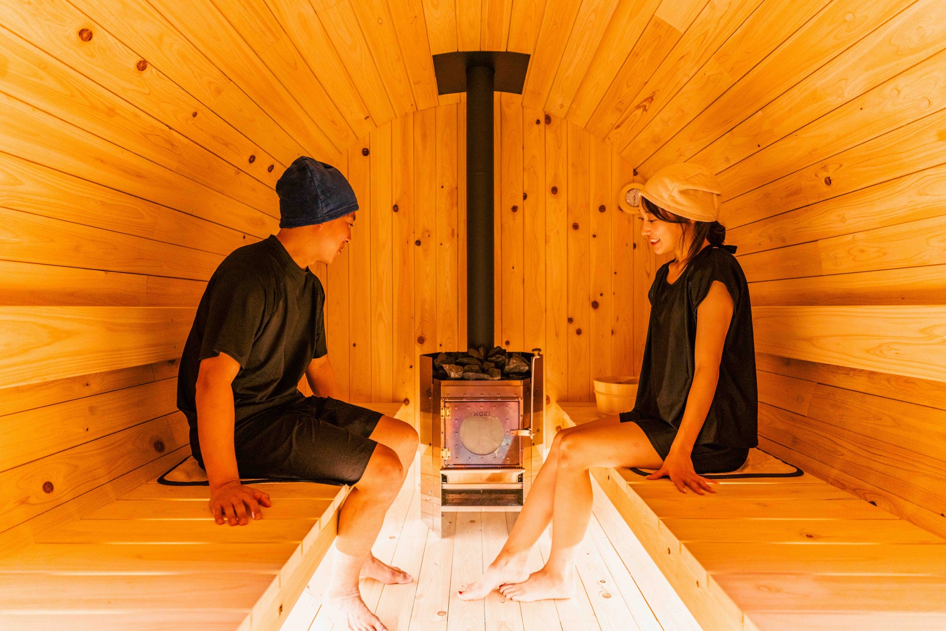 古民家をリノベーションした休憩室・更衣室・シャワー室のある母屋をはじめ、バレルサウナが広がるウッドデッキエリアが完成。無料で飲める「オリジナルサウナデトックスウォーター」に加えて、有料オプションとなるタオルセット・水着・ポンチョ・サウナハットも完備し、いよいよオープンを迎えます。