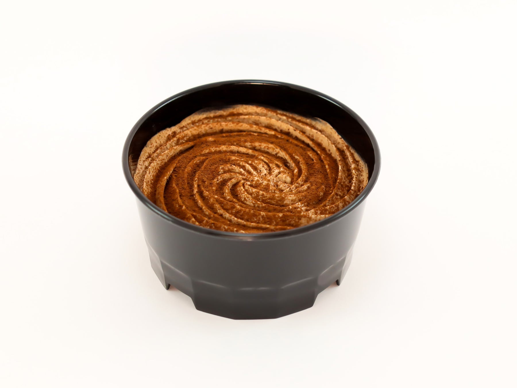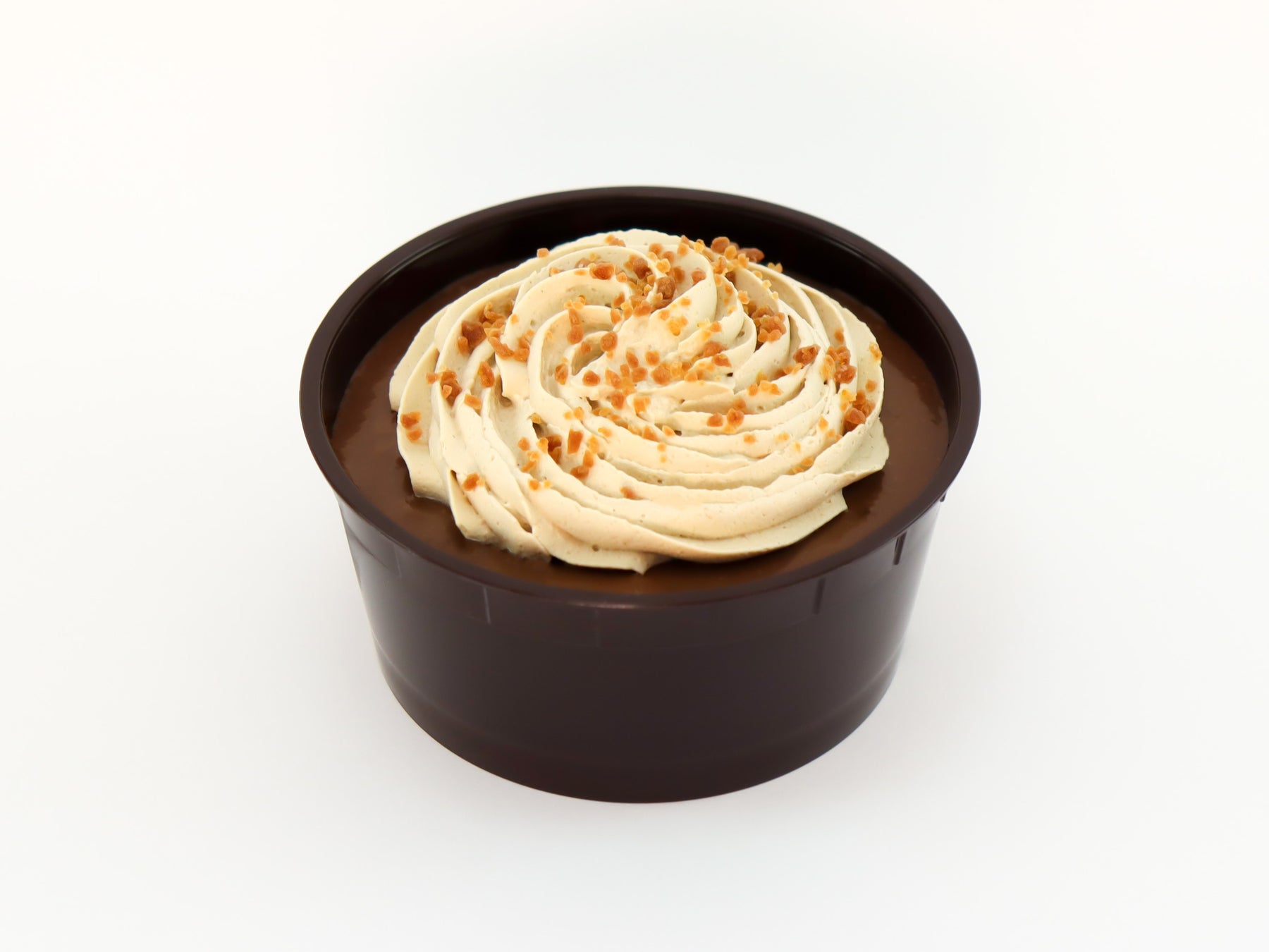 コーヒーの風味をきかせたチョコレートムースに、ミルクチョコレートソースとホイップクリームを重ね、カラメルチップをトッピングしました。