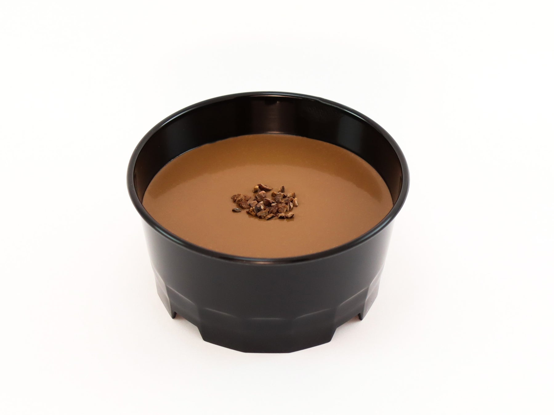 なめらかなショコラプリンに、チョコレートソースを合わせ、カカオニブをトッピングしました。