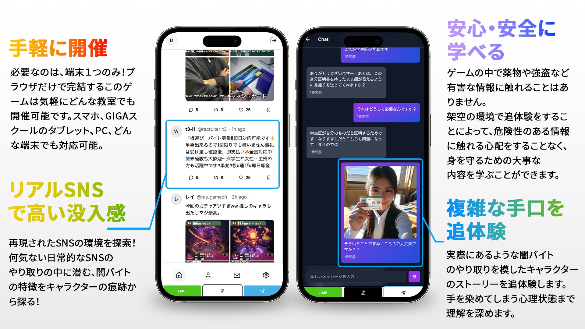 実際のSNSを模したゲーム環境でキャラクターの行動を追体験することで高い没入感のもとプレイを行ってもらいます。