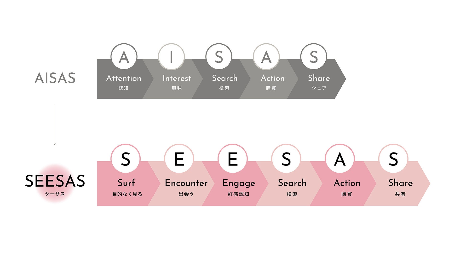 近年、消費者の購買行動はSNSを起点とした情報収集・意思決定が主流となり、マーケティング手法の変革が求められています。弊社ではSNSを中心とした消費者行動を、新たな購買行動モデル「SEESAS(シーサス)」として定義付け、縦型動画・短尺動画時代に即した効果的なマーケティング手法を模索してまいりました。