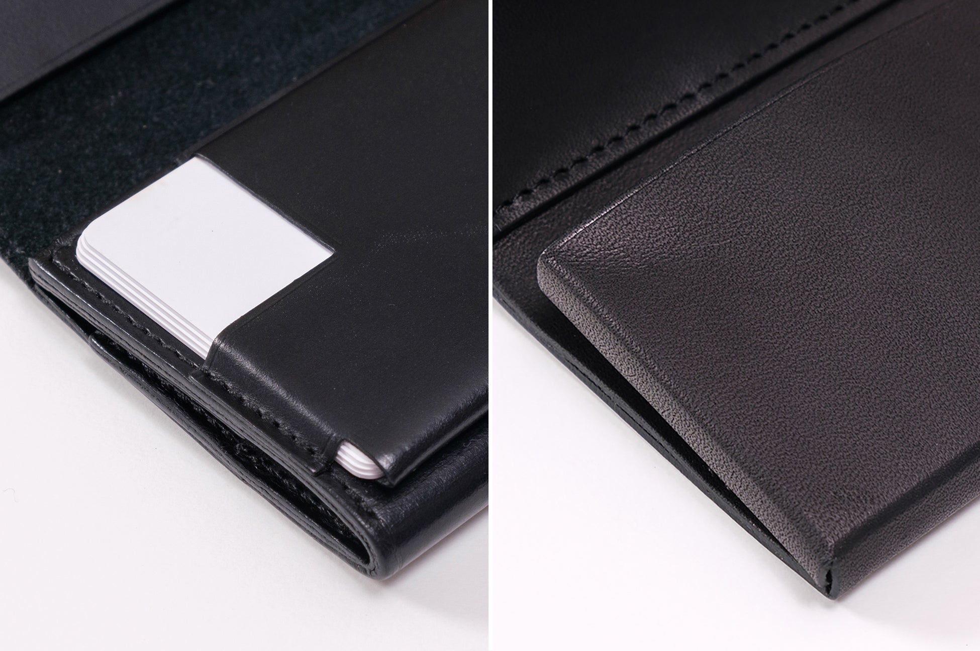 そこで、よりクレジットカードに近い幅を実現するため、ボックス型を採用し、縫製は裏側の中央部分のみに限定しました。