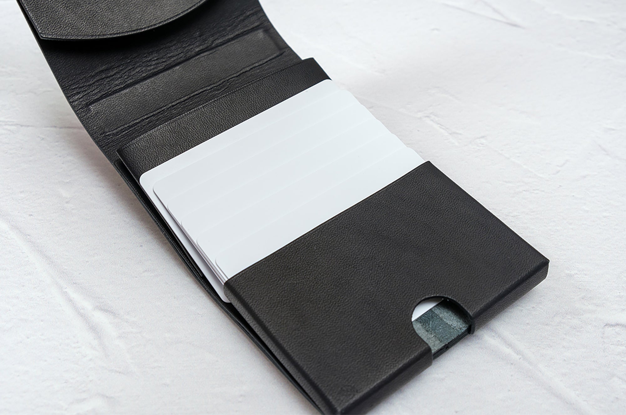 クレジットカードとほぼ同じサイズながら、8枚までのカードをスマートに収納可能。ボックス型のカードホルダーにより、カードの枚数に関わらず厚みが変わらないのも大きな魅力です。