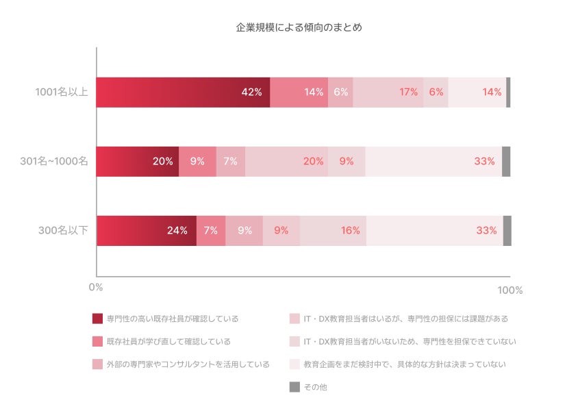 調査結果によると、企業規模別にIT・DX教育の専門性確保において明確な違いが見られます。大企業(1001名以上)では、社内の専門知識を持つ人材を活用して教育体制を整えている企業が多く、専門性の担保が進んでいることがわかります。具体的には、42%の企業が「専門性の高い既存社員が確認している」と回答しており、教育方針が未決定の企業は14%と少なく、専門性を担保できていない企業は6%と非常に低いことが分かります。
