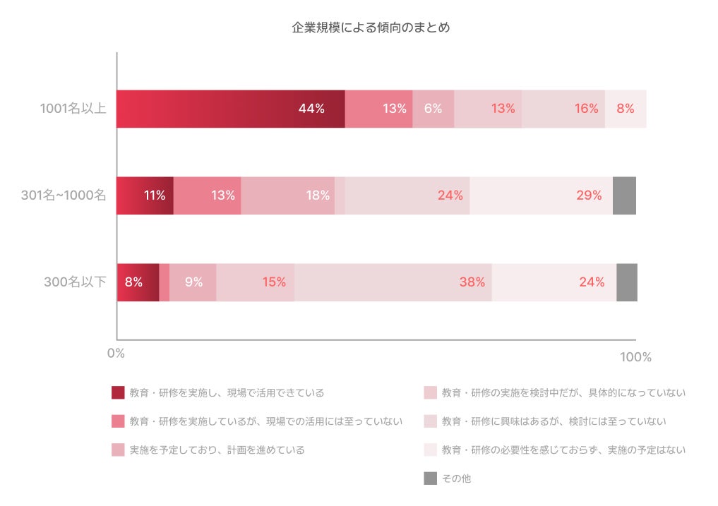 この結果から、企業規模が小さくなるほど、生成AI教育の導入が進んでいない企業が増え、特に中小企業では研修実施そのものがハードルとなり、外部リソースの活用や効果的な支援策の検討が必要であることが示唆されます。