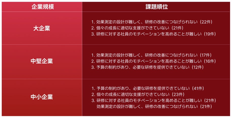 大企業(1001名以上)では、社内の専門人材を活用した教育体制が整備されているが、研修の効果測定や社員のモチベーション維持に課題がある。