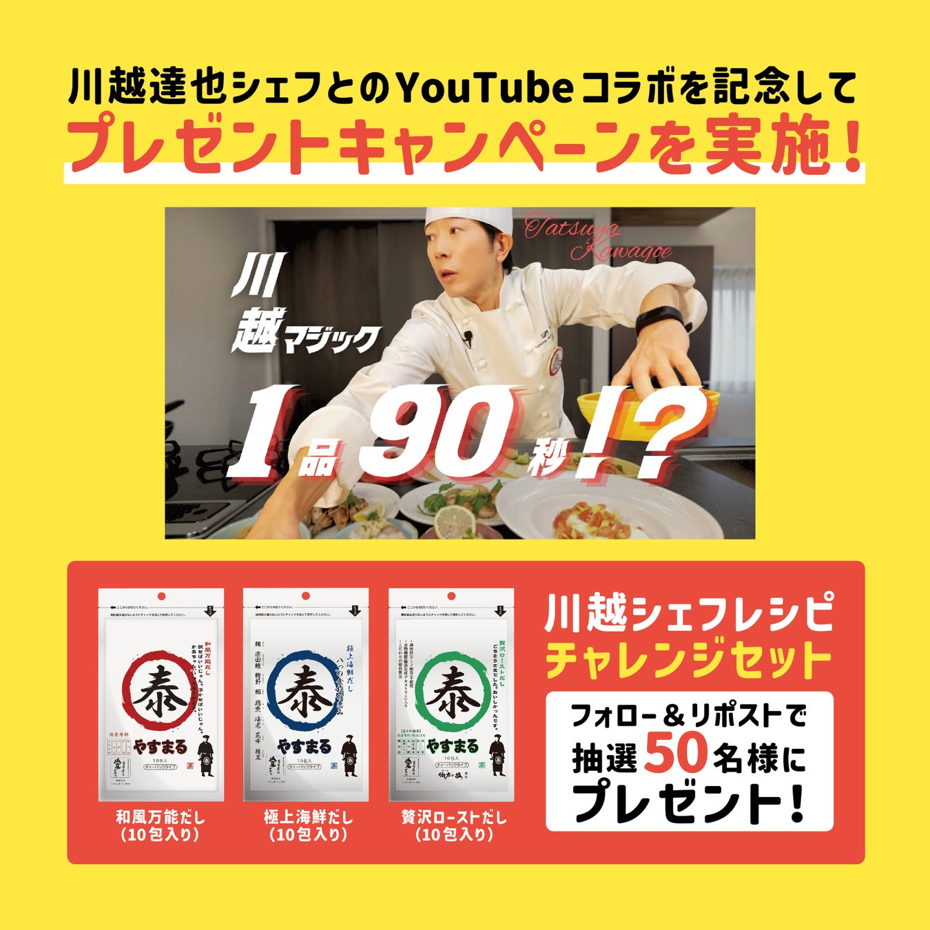 映像内で使われたやすまるだし3種「川越シェフレシピチャレンジセット」をプレゼント致します。