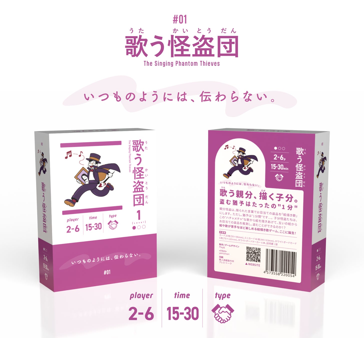「歌う怪盗団」は、親分怪盗が即興で作成する「絵描き歌」を頼りに子分怪盗が盗品を特定してチームで盗む協力型のボードゲームです。親分が1分間で即興で絵描き歌を歌い、子分はそれを基にミニボードに絵を描き、指示を読み取って盗品を探し出します。ゲームはスピード感とユーモアにあふれ、親分と子分の息の合ったプレイが求められる協力型ゲームです。