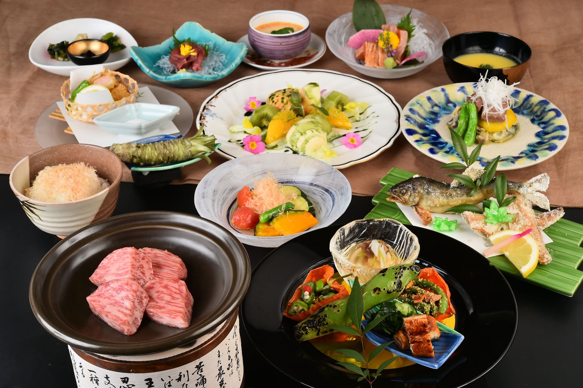 プレミアム信州牛や夏野菜、旅館の看板メニュー『コンソメ風味トマト茶碗蒸し』等をご用意。