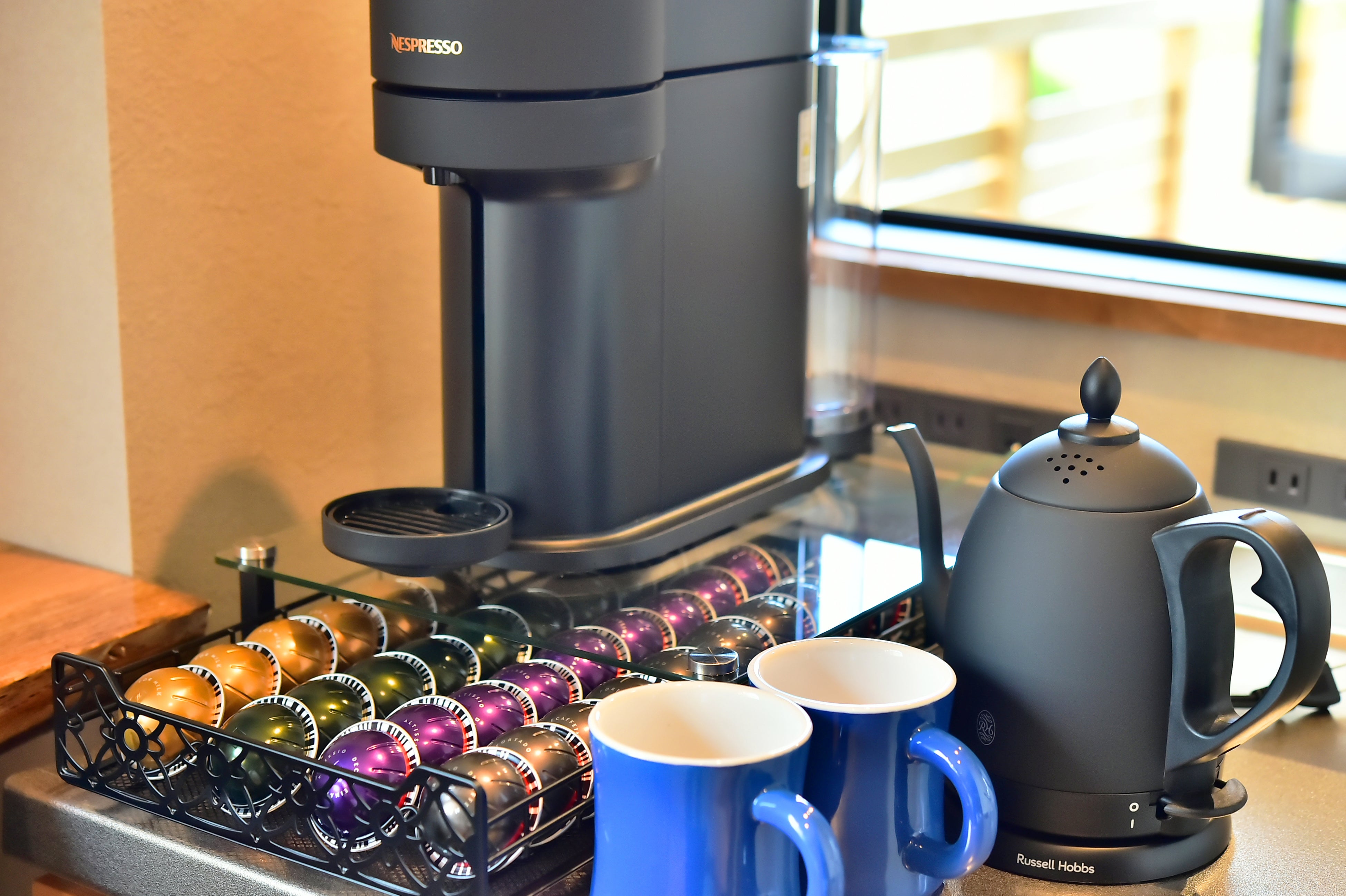・65型テレビ2台、コーヒーマシン(ネスプレッソ)、ミニキッチン、電子レンジ完備